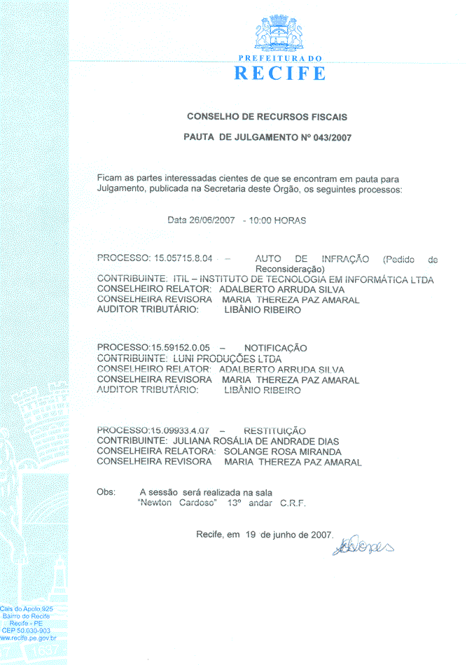 Pauta de Julgamento nº 007/07 - CRF - Dia 13/02/2007