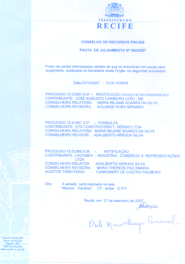 Pauta de Julgamento nº 010/07 - CRF - Dia 27/02/2007