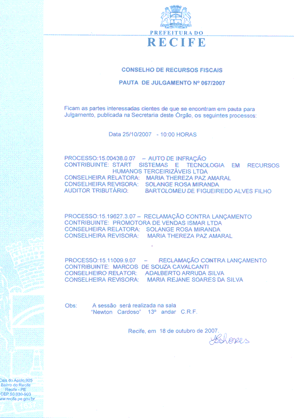Pauta de Julgamento nº 017/07 - CRF - Dia 21/03/2007