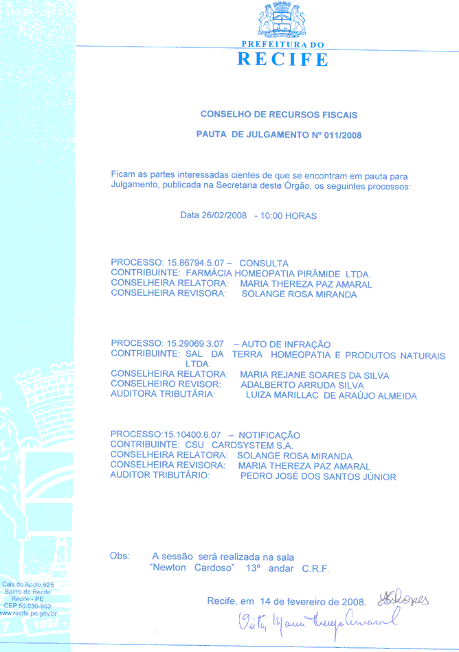 Pauta de Julgamento nº 008/07 - CRF - Dia 14/02/2007