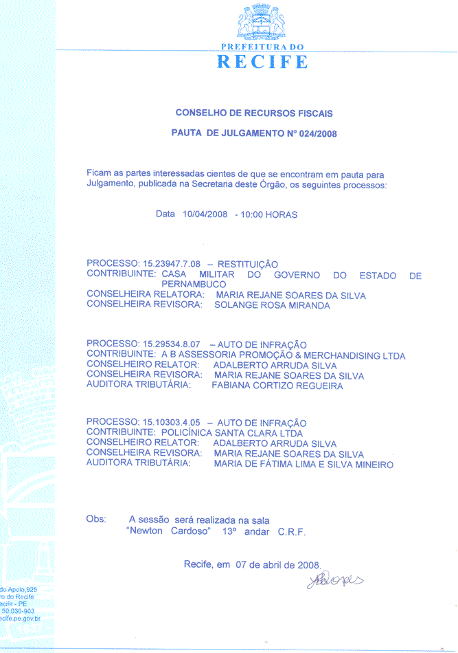 Pauta de Julgamento nº 008/07 - CRF - Dia 14/02/2007