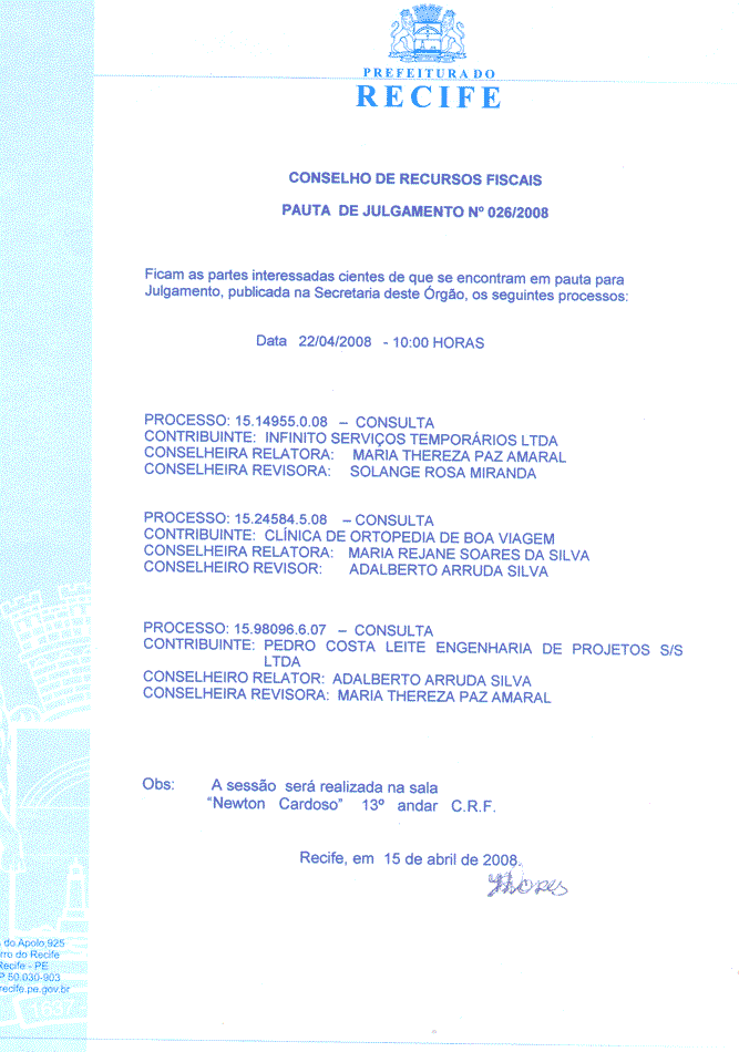 Pauta de Julgamento nº 008/07 - CRF - Dia 14/02/2007