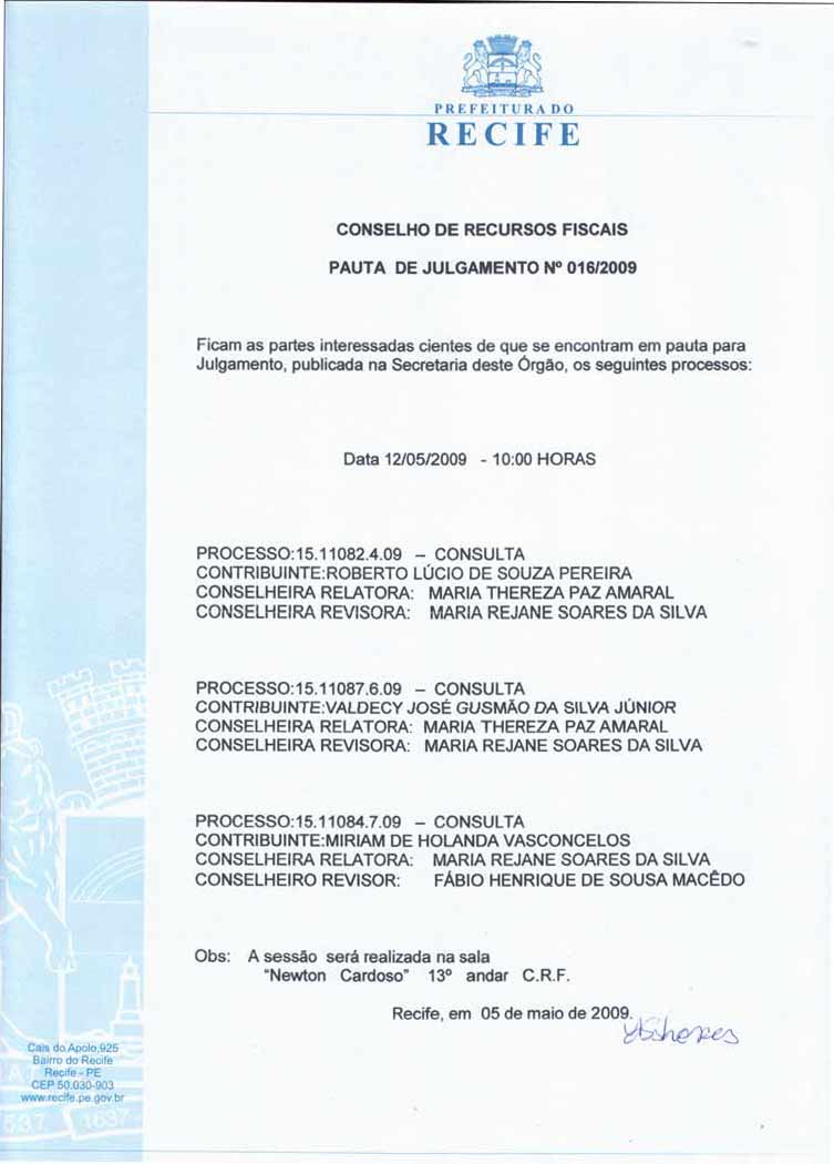 Pauta de Julgamento nº 009/07 - CRF - Dia 26/02/2007