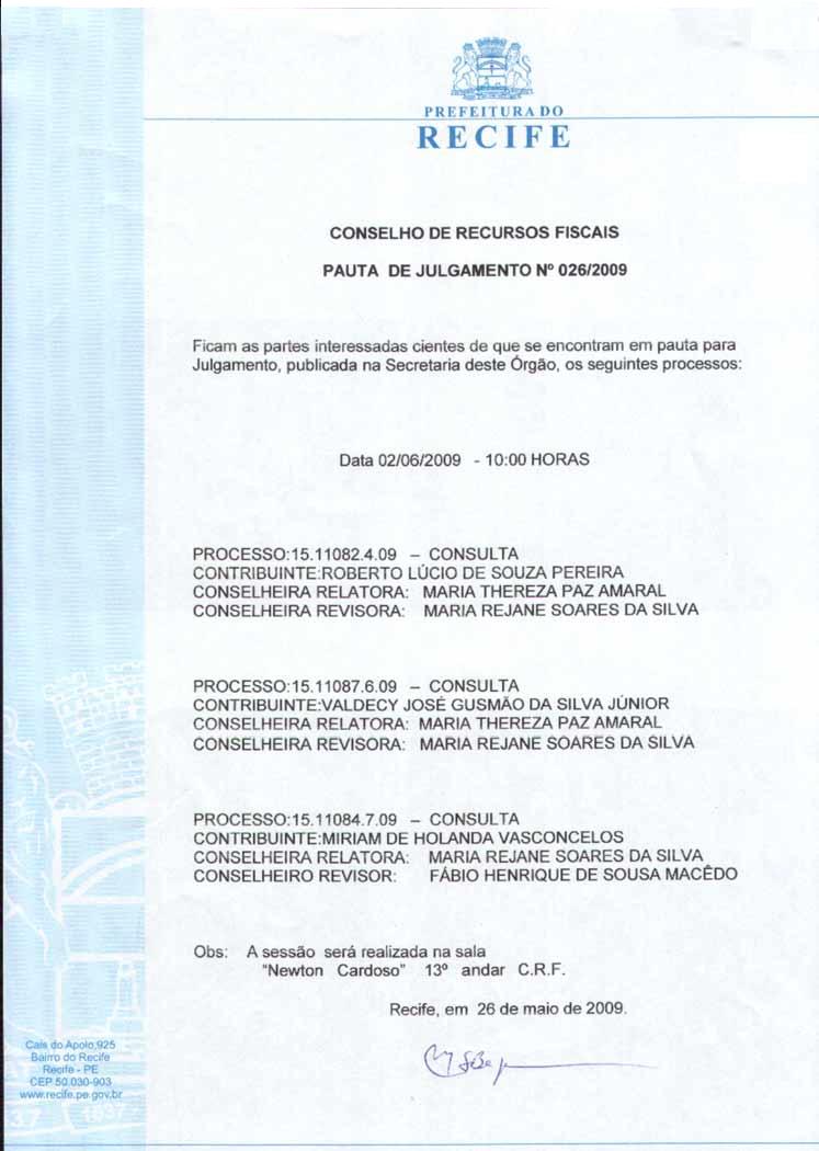 Pauta de Julgamento nº 009/07 - CRF - Dia 26/02/2007