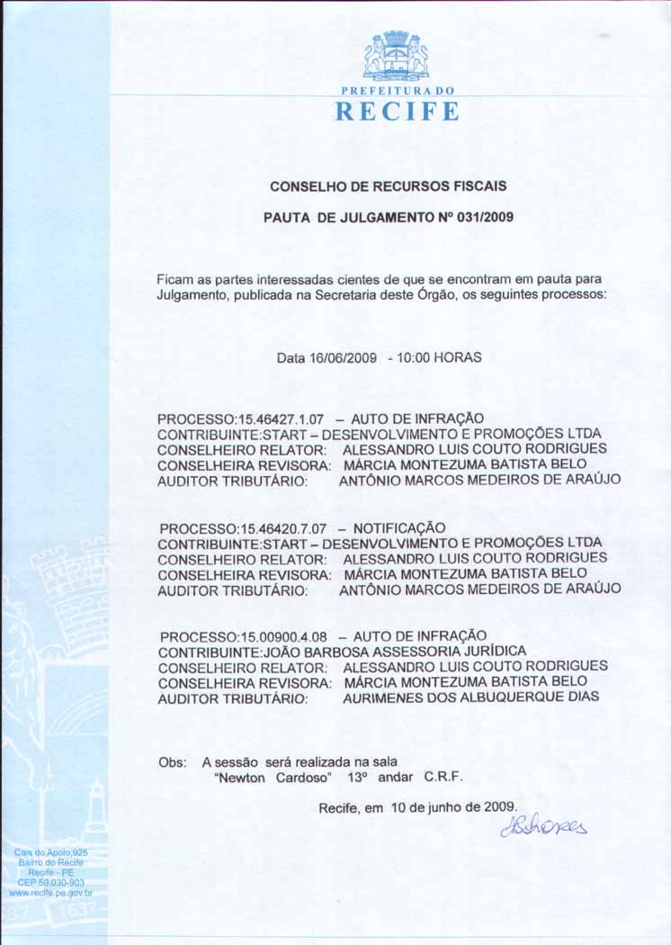 Pauta de Julgamento nº 009/07 - CRF - Dia 26/02/2007