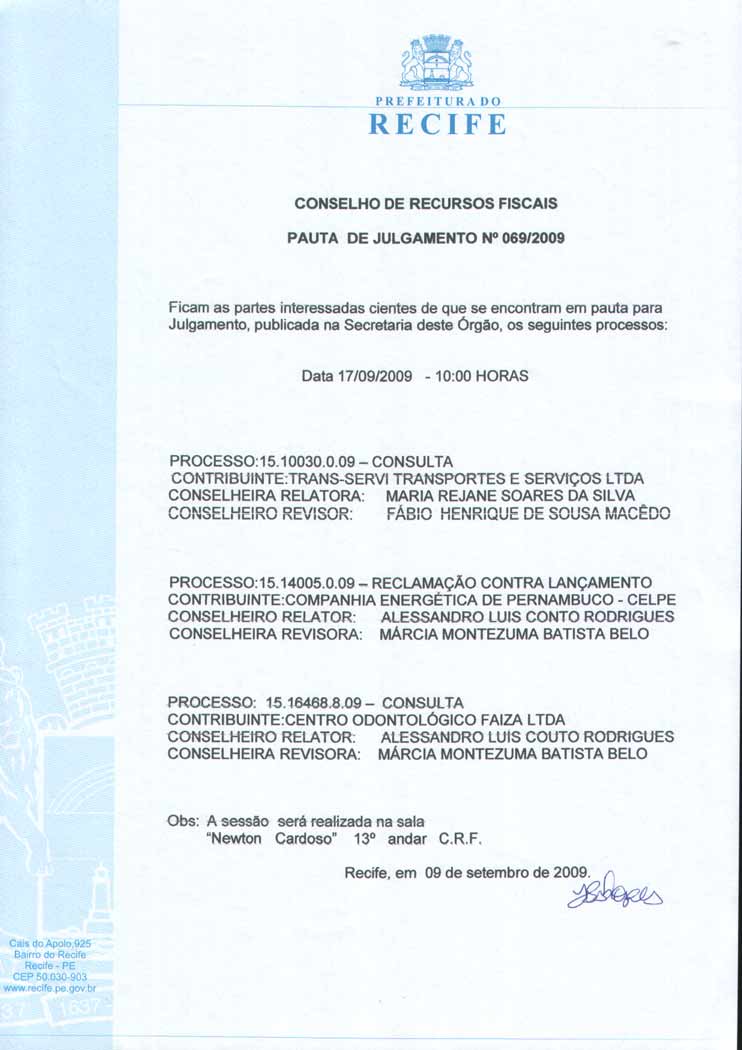 Pauta de Julgamento nº 009/07 - CRF - Dia 26/02/2007