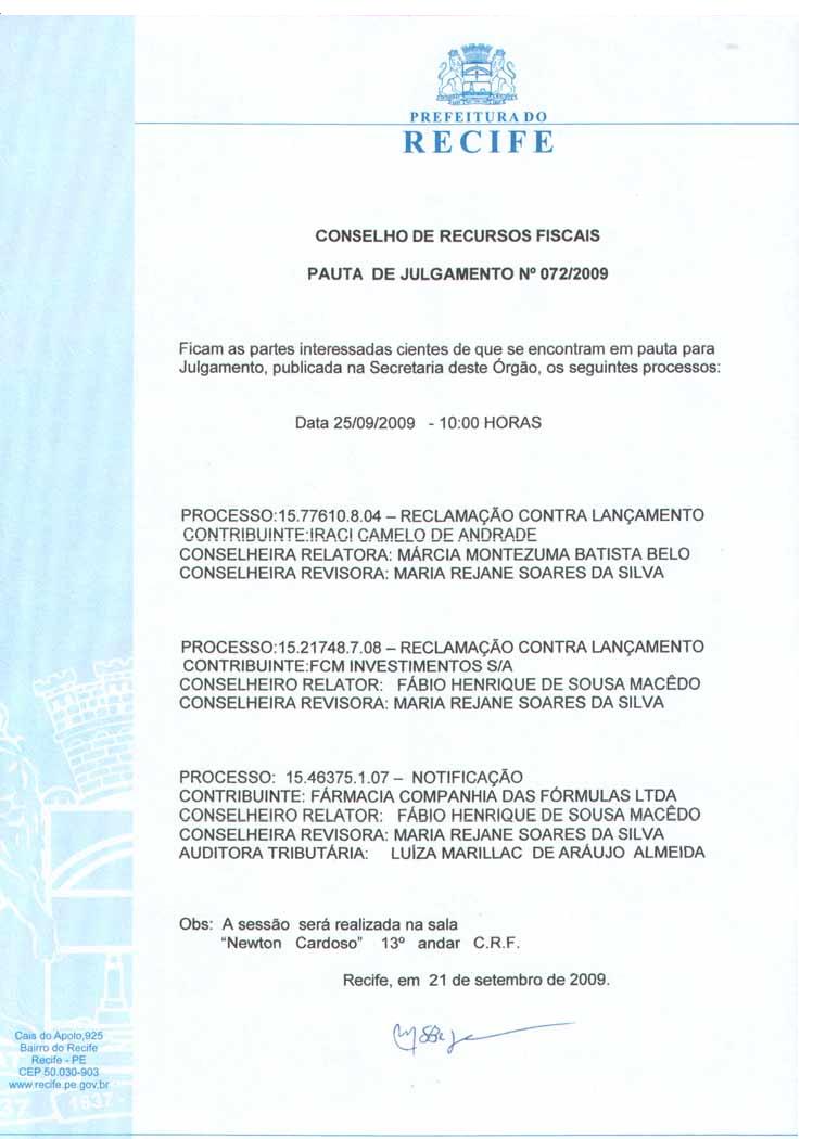 Pauta de Julgamento nº 009/07 - CRF - Dia 26/02/2007