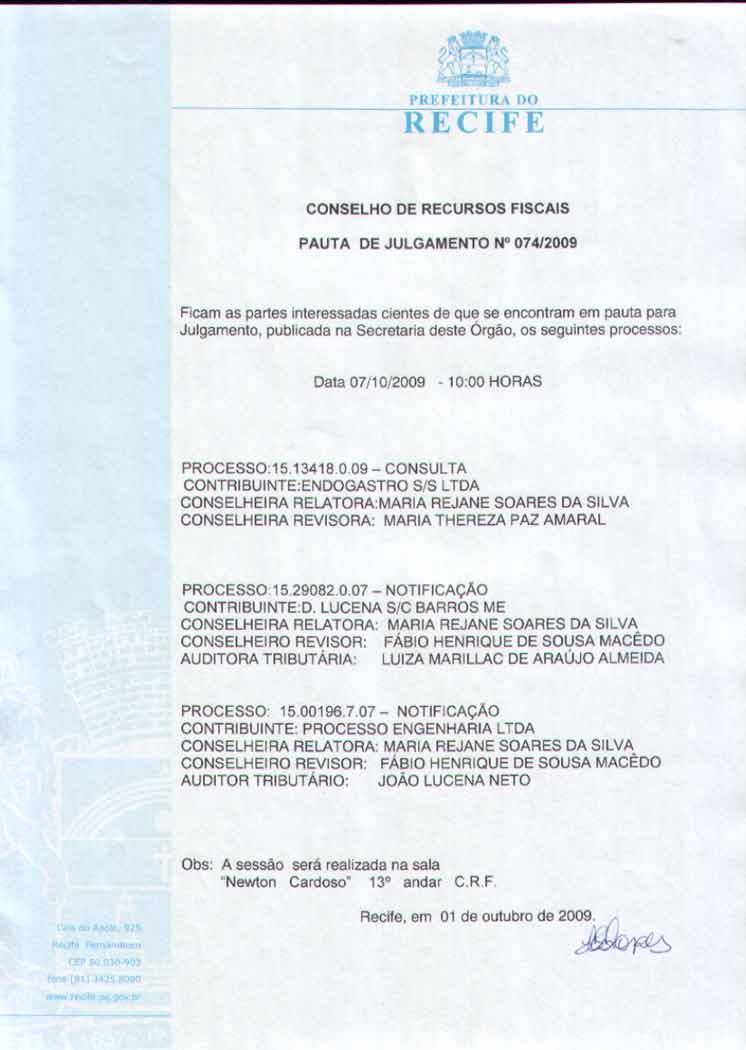 Pauta de Julgamento nº 009/07 - CRF - Dia 26/02/2007