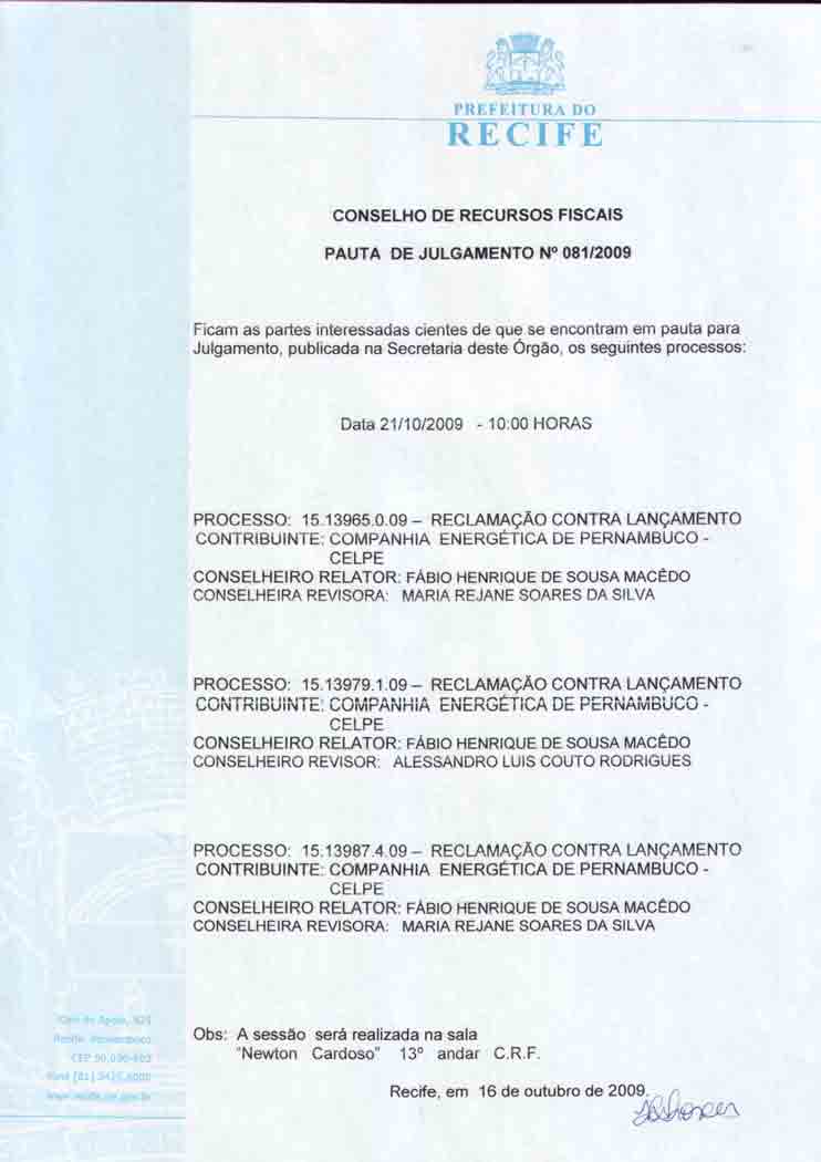 Pauta de Julgamento nº 009/07 - CRF - Dia 26/02/2007