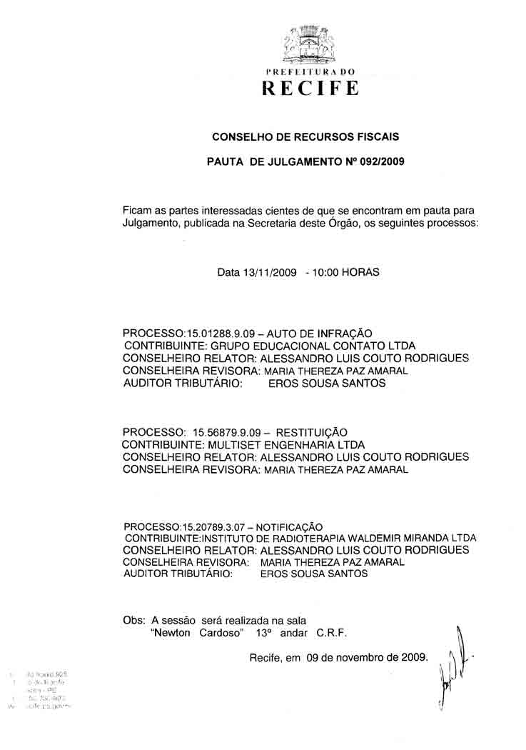 Pauta de Julgamento nº 009/07 - CRF - Dia 26/02/2007