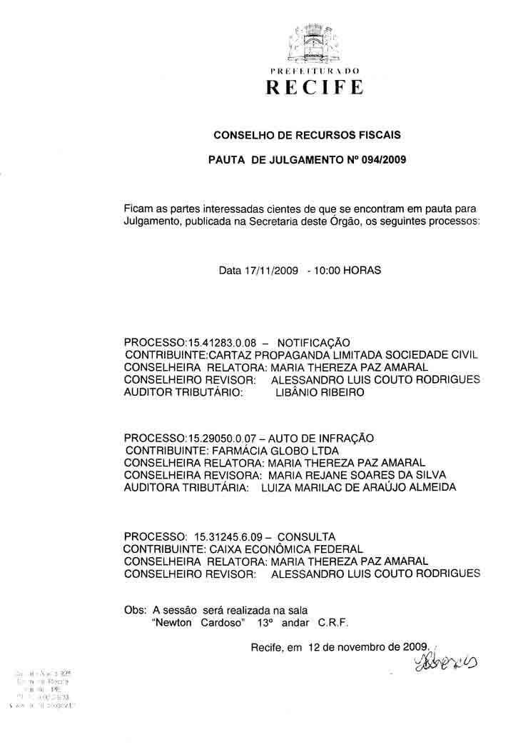 Pauta de Julgamento nº 009/07 - CRF - Dia 26/02/2007