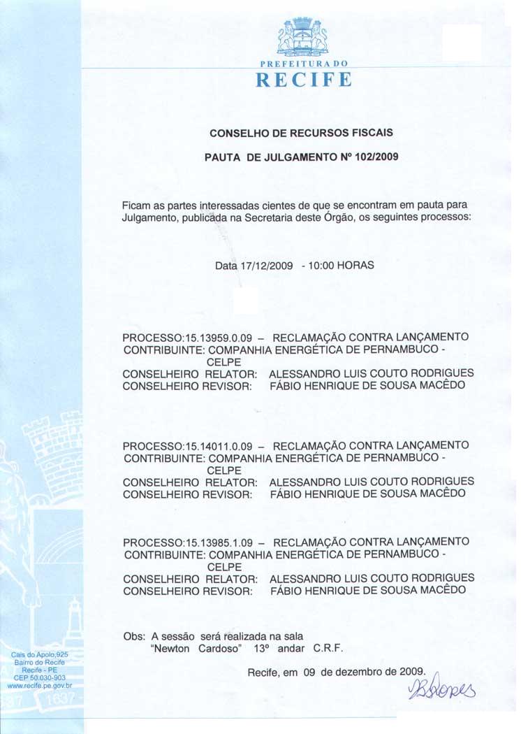 Pauta de Julgamento nº 009/07 - CRF - Dia 26/02/2007