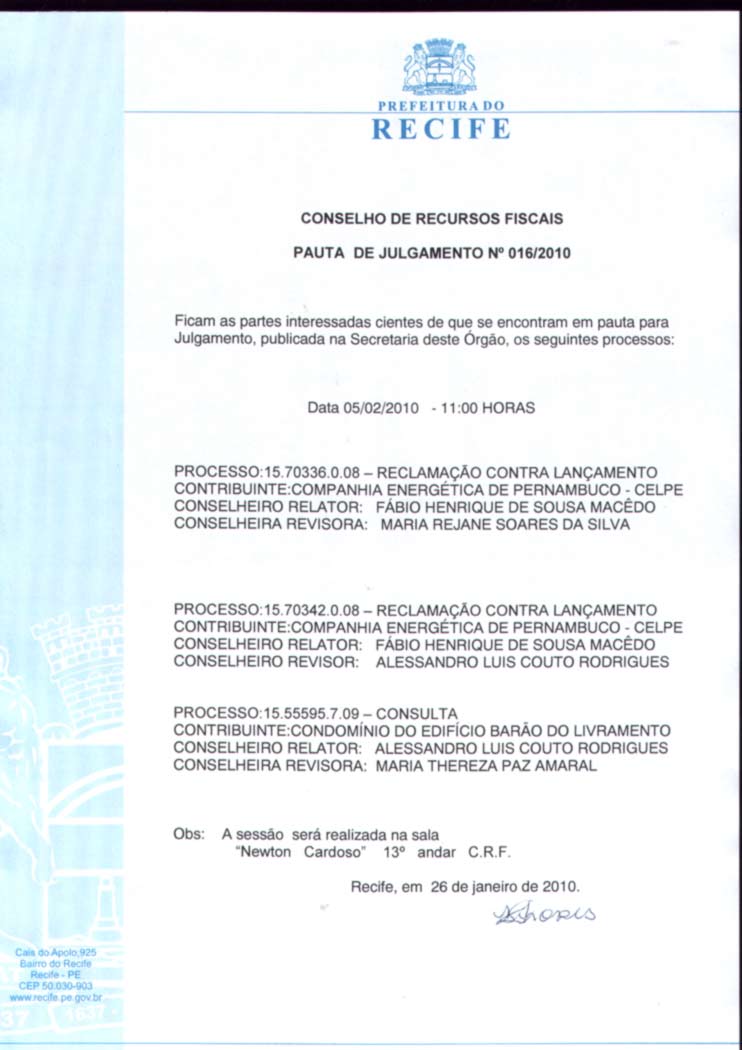 Pauta de Julgamento nº 009/07 - CRF - Dia 26/02/2007