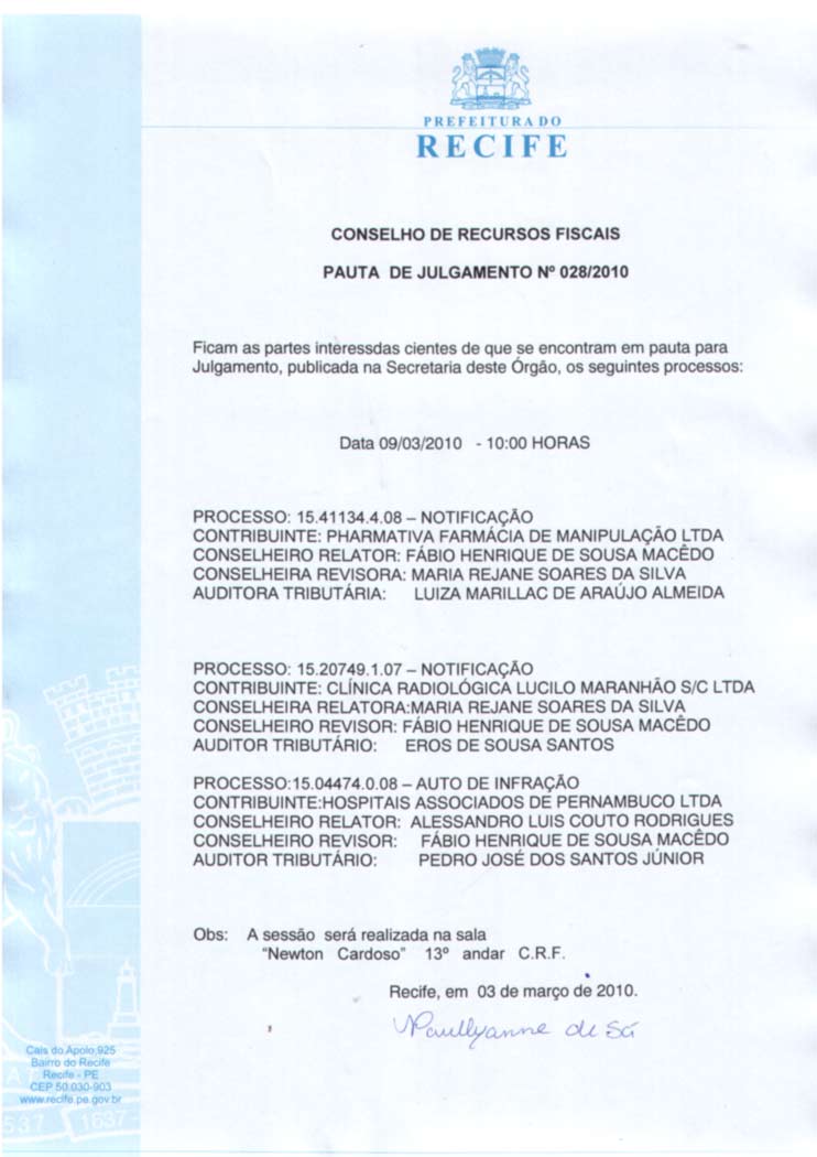 Pauta de Julgamento nº 016/07 - CRF - Dia 20/03/2007