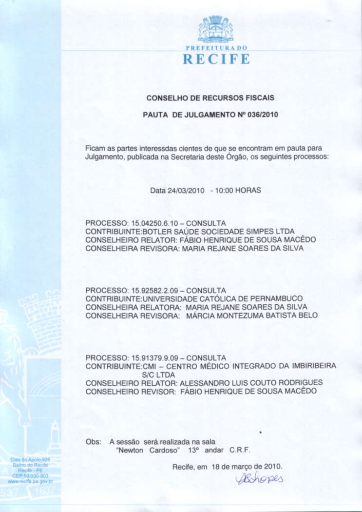 Pauta de Julgamento nº 016/07 - CRF - Dia 20/03/2007