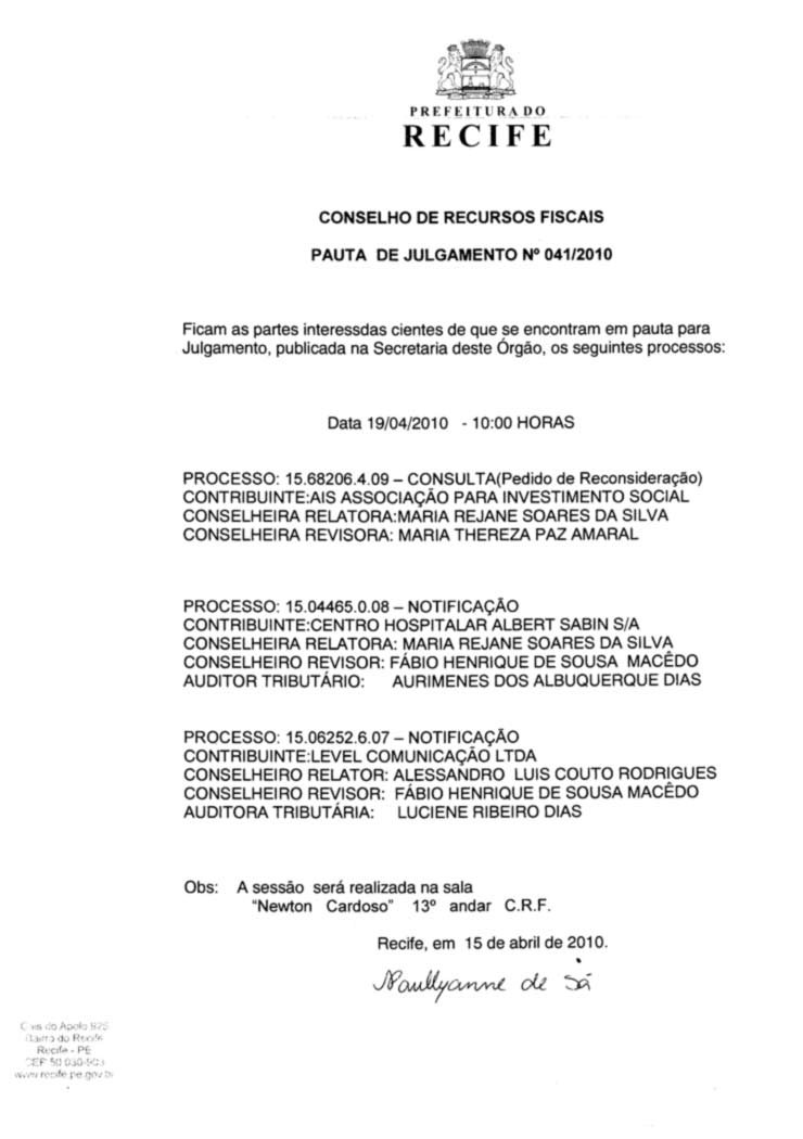 Pauta de Julgamento nº 016/07 - CRF - Dia 20/03/2007