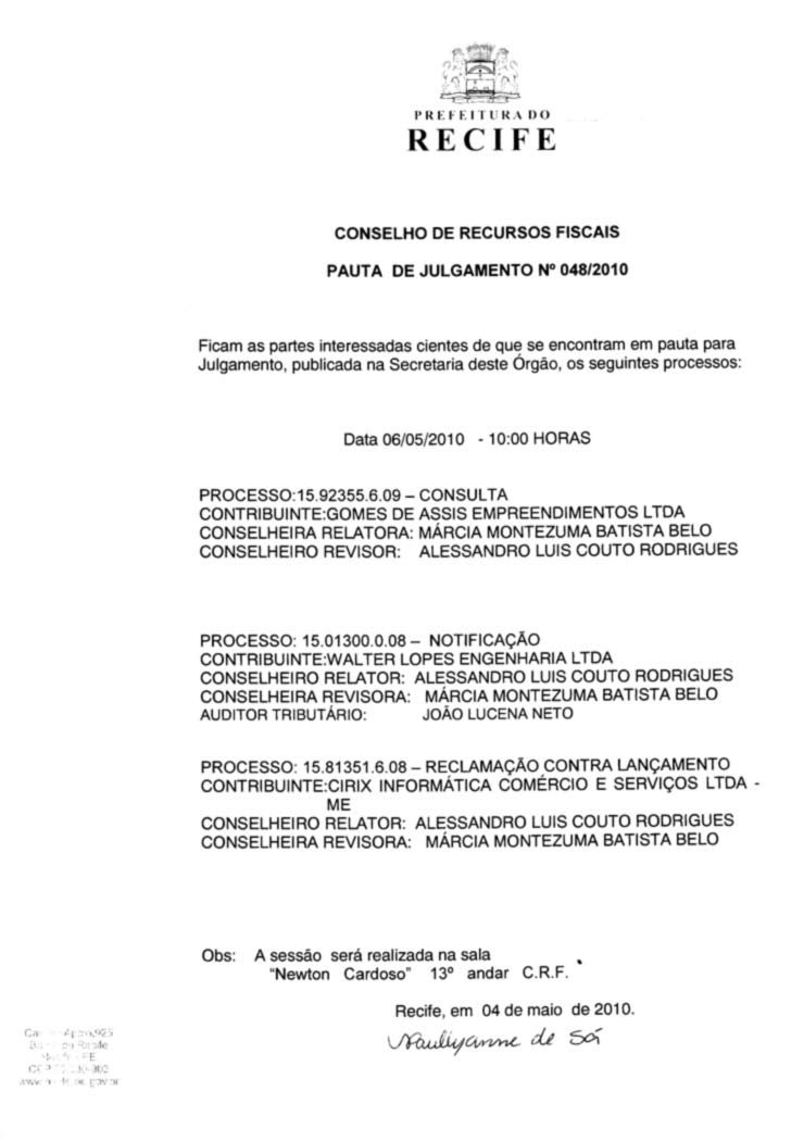 Pauta de Julgamento nº 014/07 - CRF - Dia 13/03/2007