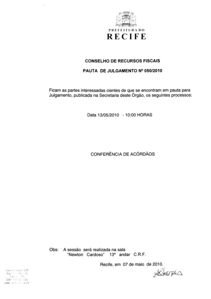 Pauta de Julgamento nº 010/07 - CRF - Dia 27/02/2007