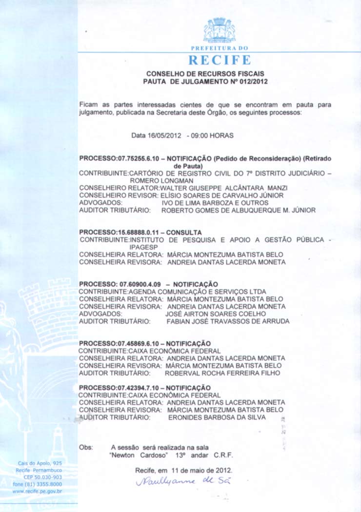 Pauta de Julgamento nº 012/07 - CRF - Dia 06/03/2007