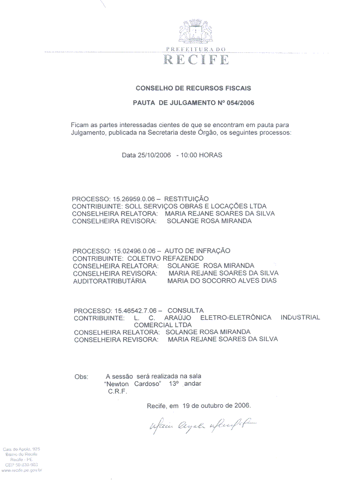 Pauta de Julgamento nº 054/06 - CRF - Dia 25/10/2006