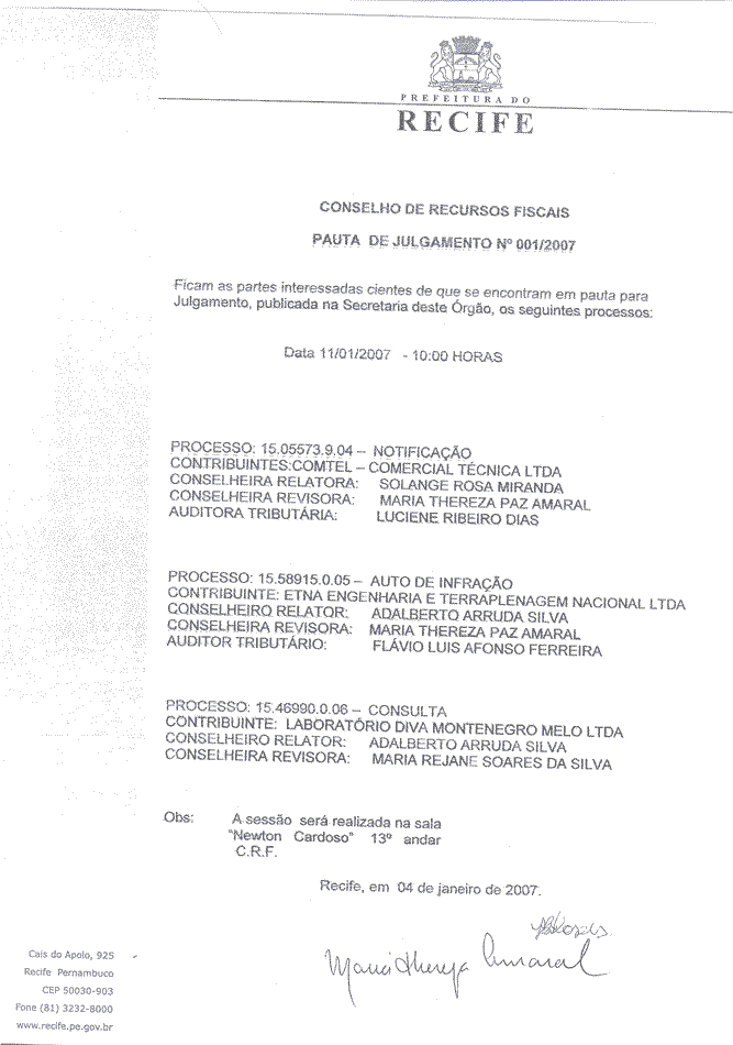 Pauta de Julgamento nº 004/07 - CRF - Dia 23/01/2007
