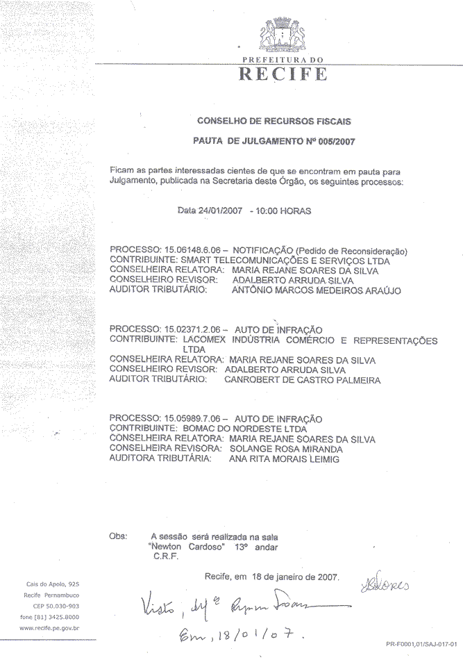 Pauta de Julgamento nº 005/07 - CRF - Dia 24/01/2007